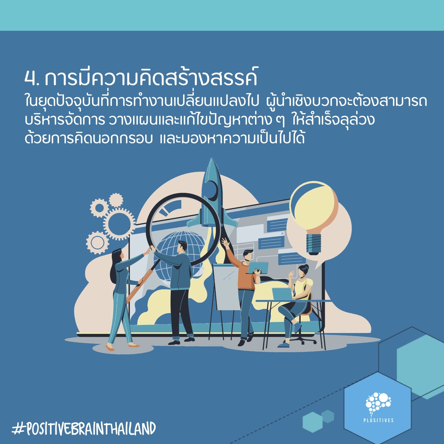 4. การมีความคิดสร้างสรรค์ ในการทำงานยุคปัจจุบันเราอาจเริ่มเรียนรู้ว่าวิธีการเดิมที่เราเคยทำแล้วประสบความสำเร็จในอดีต อาจไม่ใช่วิธีการที่Work อีกต่อไปในตอนนี้ ดังนั้นผู้นำเชิงบวกจะต้องสามารถบริหารจัดการ วางแผนและแก้ไขปัญหาต่างๆ ให้สำเร็จลุล่วงด้วยการคิดนอกกรอบ และมองหาความเป็นไปได้ โดยไม่จำกัดตัวเองเฉพาะสิ่งที่เคยทำ มีประสบการณ์มาก่อน หรือแม้แต่ถนัดเท่านั้น การมีความคิดสร้างสรรค์อาศัยกรอบความคิดแบบเติบโต(Growth Mindse) ควบคู่ไปกับการมองโลก ในแง่บวกบนพื้นฐานของความเป็นจริง (Realistic Optimism) เพราะการที่เรายังต้องลองผิดลองถูกในการทำงาน เราเองจำเป็นที่จะต้องเรียนรู้ แก้ไข ปรับปรุง รวมถึง ยอมรับข้อผิดพลาดที่อาจจะเกิดขึ้นซึ่งทัศนคติเชิงบวกจะสามารถช่วยให้คุณจัดการความรู้สึกที่ไม่ดีที่เกิดจากการทำงานที่ผิดพลาดนั้นได้