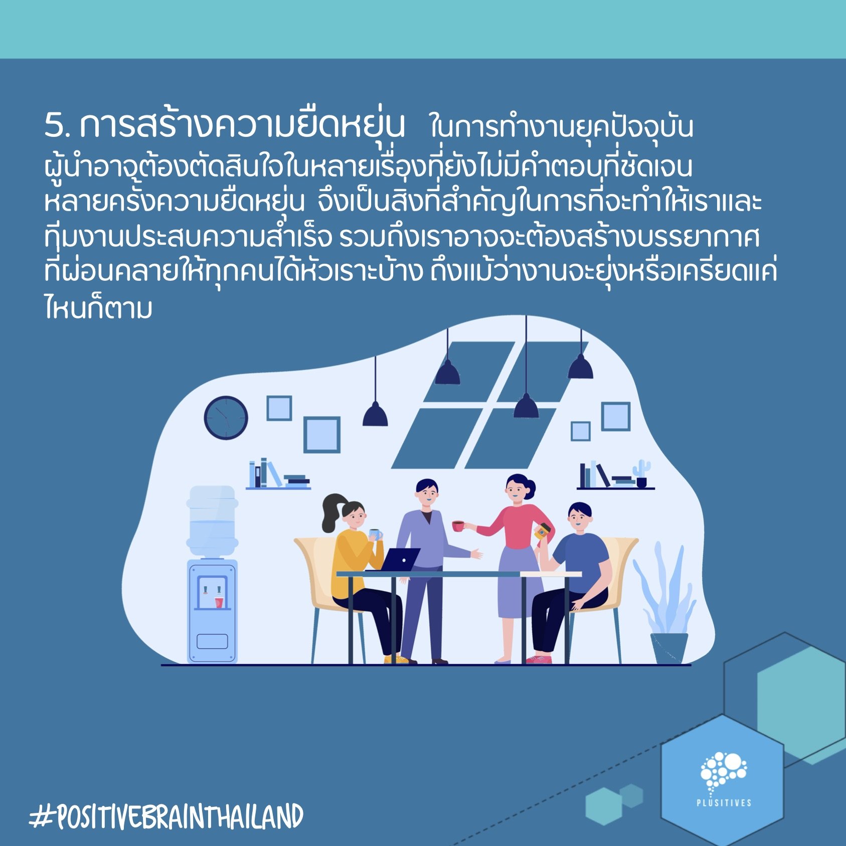 5. การสร้างความยืดหยุ่น ในการทำงานยุคปัจจุบัน ผู้นำอาจต้องตัดสินใจในหลายเรื่องที่ยังไม่มีคำตอบที่ชัดเจน หลายครั้งความยืดหยุ่นจึงเป็นสิ่งที่สำคัญในการที่จะทำให้เราและทีมงานประสบความสำเร็จ ต่อให้เราและทีมงานพยายามทำงานให้ดีและไม่มีข้อผิดพลาดมากแค่ไหนก็ตาม การเปลี่ยนแปลงหรือสิ่งที่ไม่คาดคิด โดยเฉพาะอย่างยิ่งจากปัจจัยที่เราอาจจะควบคุมไม่ได้ สามารถเกิดขึ้นได้เสมอ ดังนั้นความสามารถในการยอมรับและยืดหยุ่นจะช่วยให้เรามองปัญหาและความท้าทายนั้น อย่างเปิดใจ และหาทางแก้ไขหรือรับมือได้อย่างสร้างสรรค์ อีกทั้งยังถือเป็นโอกาสที่ทำให้คนในทีมได้เห็นความเป็นมืออาชีพในการพยายามแก้ไขปัญหาโดยไม่ใช้อารมณ์และยอมรับในปัญหานั้น รวมถึงเราอาจจะต้องสร้างบรรยากาศที่ผ่อนคลายให้ทุกคนได้หัวเราะบ้าง ถึงแม้ว่างานจะยุ่งหรือเครียดแค่ไหนก็ตาม ผู้นำที่ประสบความสำเร็จในยุคปัจจุบันจะต้องมีทั้งทักษะการทำงานและทักษะการอยู่ร่วมกับผู้อื่น ความสามารถในการมีปฏิสัมพันธ์เชิงบวกกับผู้อื่น จะช่วยให้เราได้รับความไว้วางใจ และสามารถนำพาทีมและองค์กรให้พัฒนาก้าวไปข้างหน้าไปได้อย่างต่อเนื่อง