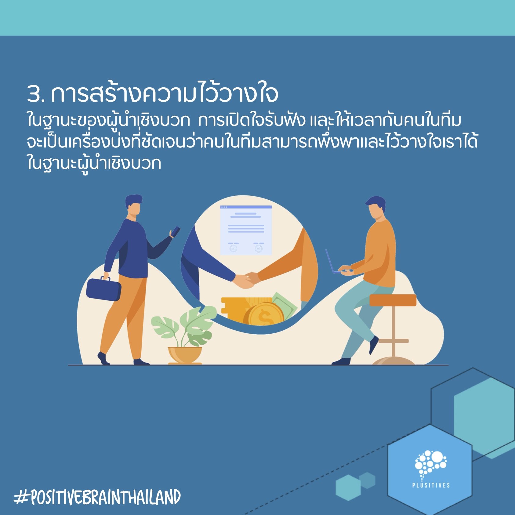 3. การสร้างความไว้วางใจ การแสดงออกอย่างเป็นมิตร รวมถึงส่งสัญญาณให้คนในทีมงานทราบว่าเราพร้อมและสามารถรับฟังเพื่อช่วยเหลือคนในทีมทุกคนเมื่อเกิดปัญหา โดยเฉพาะอย่างยิ่งในช่วงเวลานี้ที่ทุกคนต่างมีเวลาและพลังงานจำกัดจะเป็นเครื่องบ่งที่ชัดเจนบว่าคนในทีมสามารถพึ่งพาและไว้วางใจเราได้ในฐานะผู้นำเชิงบวกนอกจากนี้ข้อดีในการเปิดใจรับฟัง และให้เวลากับคนในทีมของเราก็คือ เราจะสามารถรับทราบข้อมูลที่สำคัญต่อการปรับปรุงหรือพัฒนางาน รับทราบปัญหาและสาเหตุของปัญหาที่แท้จริง อีกทั้งยังช่วยสร้างความสัมพันธ์ที่ดีในทีมงานของเราอีกด้วย คนในทีมงานของเราก็จะรู้สึกอุ่นใจ ว่ามีคนคอยสนับสนุนอยู่ข้างหลัง ไม่ได้ปล่อยให้พวกเขาออกไปทำงานโดยลำพัง แต่ยังมีหัวหน้าที่คอยระวังหลังให้ พร้อมรับฟังและช่วยเหลืออยู่เสมอ