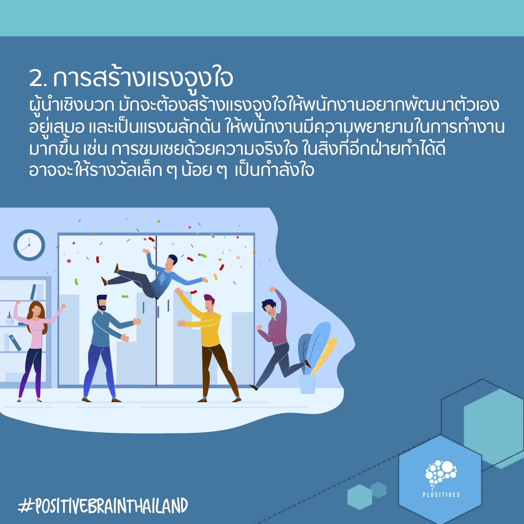 2. การสร้างแรงจูงใจ ผู้นำเชิงบวกคือ Role Model หรือตัวอย่างที่ดีที่ทำให้คนอื่นในทีมรู้สึกอยากปฏิบัติตาม และในเรื่องการเรียนรู้และพัฒนาตนเองก็เช่นกัน ผู้นำเชิงบวก มักจะต้องสร้างแรงจูงใจให้พนักงานอยากพัฒนาตัวเองอยู่เสมอ และเป็นแรงพลักดัน