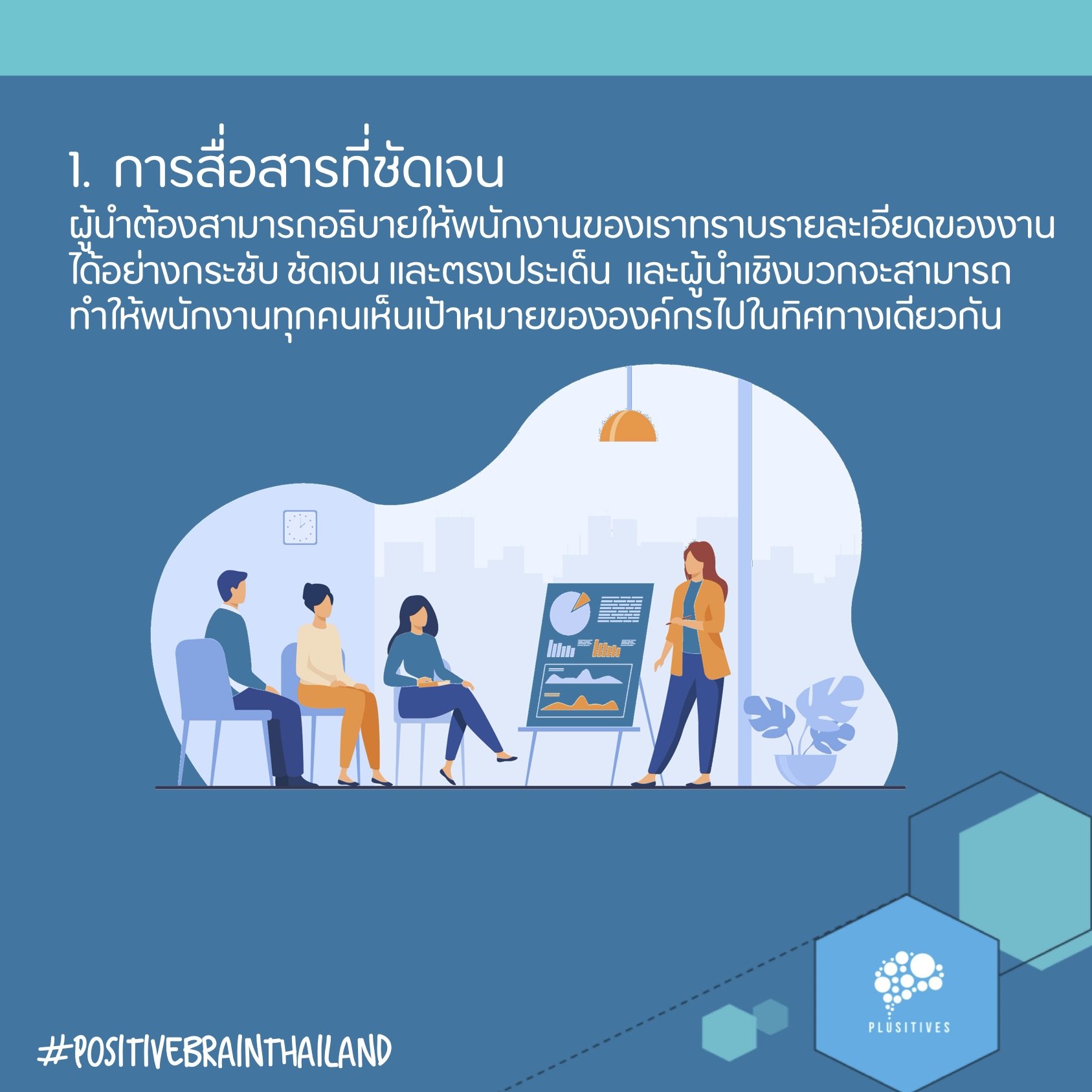 1. การสื่อสารที่ชัดเจน ในฐานะผู้นำเราต้องสามารถอธิบายให้พนักงานของเราทราบรายละเอียดของงาน โดยเฉพาะใจความสำคัญของงานๆ นั้นได้อย่างกระชับ ชัดเจนและตรงประเด็น ผู้นำเชิงบวกจะสามารถทำให้พนักงานทุกคนเห็นเป้าหมายขององค์กรไปทิศทางเดียวกัน นอกจากนี้เรายังจะต้องเริ่มปรับตัวให้เกิดความเชี่ยวชาญในการสื่อสารทุกรูปแบบ ไม่ว่าจะเป็นการสนทนาแบบตัวต่อตัว (Face To Face) การสื่อสารทางโทรศัพท์ อีเมล วิดีโอคอล หรือ Line แชท