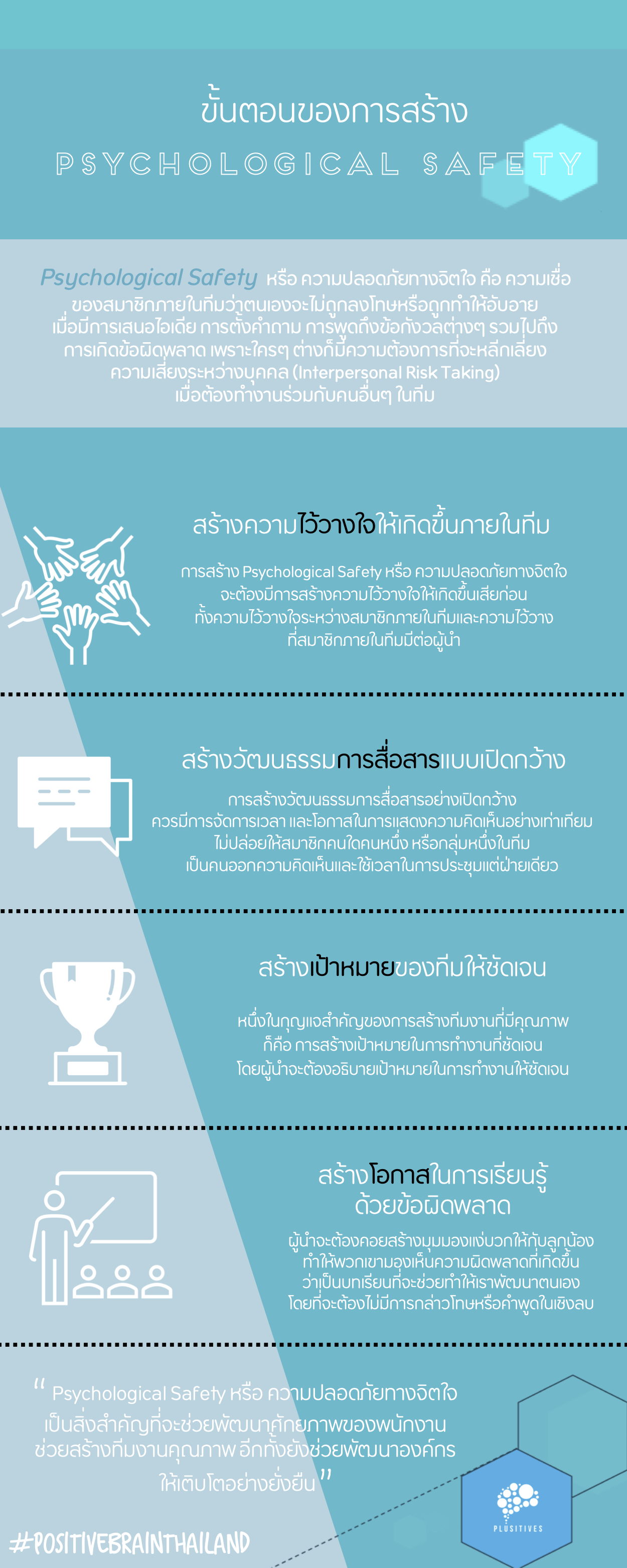 จะเห็นว่า Psychological Safety หรือ ความปลอดภัยทางจิตใจ เป็นสิ่งสำคัญที่จะช่วยพัฒนาศักยภาพของพนักงาน ช่วยสร้างทีมงานคุณภาพ อีกทั้งยังช่วยพัฒนาองค์กรให้เติบโตอย่างยั่งยืน โดย Psychological Safety หรือ ความปลอดภัยทางจิตใจ จะต้องอาศัยความสามารถของผู้นำในการกระตุ้นและสนับสนุนให้ทุกคนภายในทีมมีความคิดไปในทิศทางเดียวกัน ซึ่งหากองค์กรสามารถสร้างวิธีการหรือวัฒนธรรมในการทำงานที่ก่อให้เกิด Psychological Safety ได้แล้ว ความคิดสร้างสรรค์ (Creativity) และการสร้างนวัตกรรม (Innovation) ก็มีโอกาสเกิดได้มากขึ้นในองค์กรของคุณ