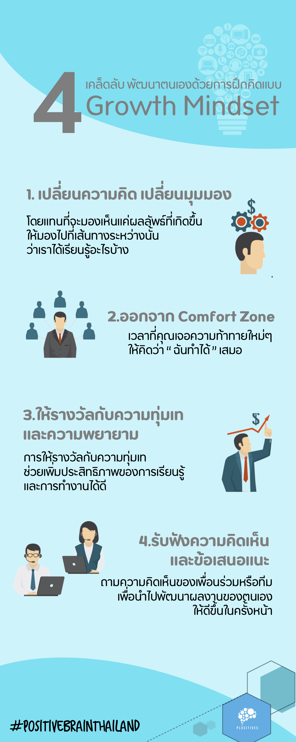 คำกล่าวที่ว่า “Learning is a lifelong process.” หรือ การเรียนรู้คือกระบวนการที่เกิดขึ้นตลอดชีวิต จาก Peter Drucker ใช้อธิบายได้เป็นอย่างดี เพราะคนที่มี Growth Mindset คือ คนที่พร้อมเรียนรู้สิ่งต่างๆ อยู่ตลอดเวลา ไม่ปิดกั้นตนเองเวลาเจอเรื่องที่ไม่เข้าใจ และจะพยายามหาวิธีพัฒนาตนเองอยู่เสมอ จากบทความเรื่องThe Growth Mindset Starts in the Brain ของ Margie Meacham