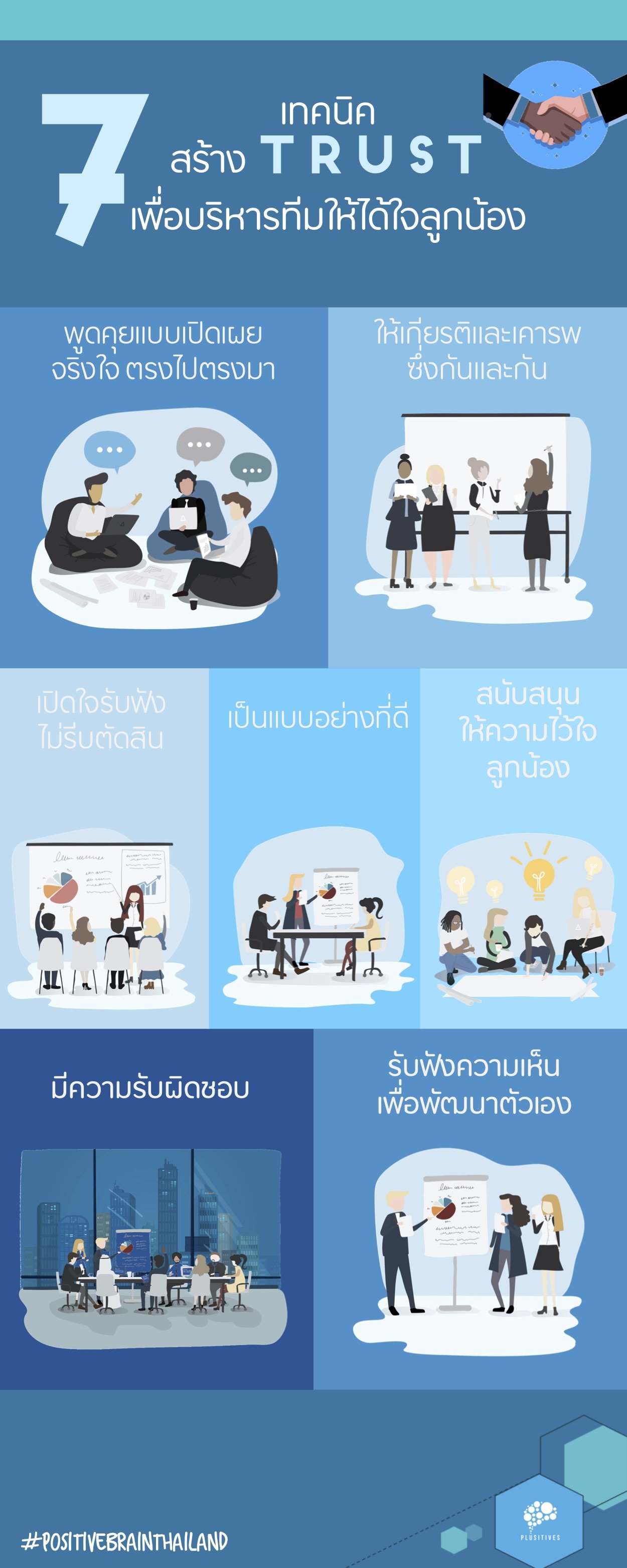 Leadership นั้นมีบทบาทและมีความสำคัญมากๆ กับการทำงานในยุคศตวรรษที่21 เพราะถ้าหากขาดการนำทีมที่ดีของผู้นำไป สมาชิกที่เหลืออาจจะทำงานแบบไร้ทิศทาง ไม่มีจุดมุ่งหมาย ทำให้คุณภาพของงานไม่เป็นไปตามที่วางแผนไว้ หรือในบางครั้ง ทีมมีผู้นำที่มี Leadership skill หลากหลายก็จริง แต่กลับไม่ได้รับความไว้วางใจจากลูกน้อง ซึ่งสิ่งนี้เองจะส่งผลต่อประสิทธิภาพในการทำงานและการบริหารทีมในองค์รวมเช่นกัน ดังนั้น ในองค์กรที่ให้ความสำคัญกับการอบรมพัฒนาผู้นำก็มักจะเน้นการสร้างทักษะความเป็นผู้นำควบคู้ไปกับหัวใจสำคัญของการสร้างทีมงาน นั่นก็คือการสร้าง Trust หรือ การสร้างความเชื่อใจให้เกิดขึ้นระหว่างหัวหน้าและลูกน้องด้วย เพราะความเชื่อใจหรือ Trust มีส่วนสำคัญที่จะทำให้ทีมเกิดการร่วมมือร่วมใจจนทำงานได้สำเร็จตามเป้าหมาย แต่ผู้นำควรมีวิธีการแบบไหน ปฏิบัติต่อลูกน้องอย่างไร ถึงจะสร้างความเชื่อใจได้ วันนี้เราได้รวบรวมข้อมูลที่เป็นประโยชน์สำหรับผู้นำที่ต้องการพัฒนาตัวเองมาฝากกัน