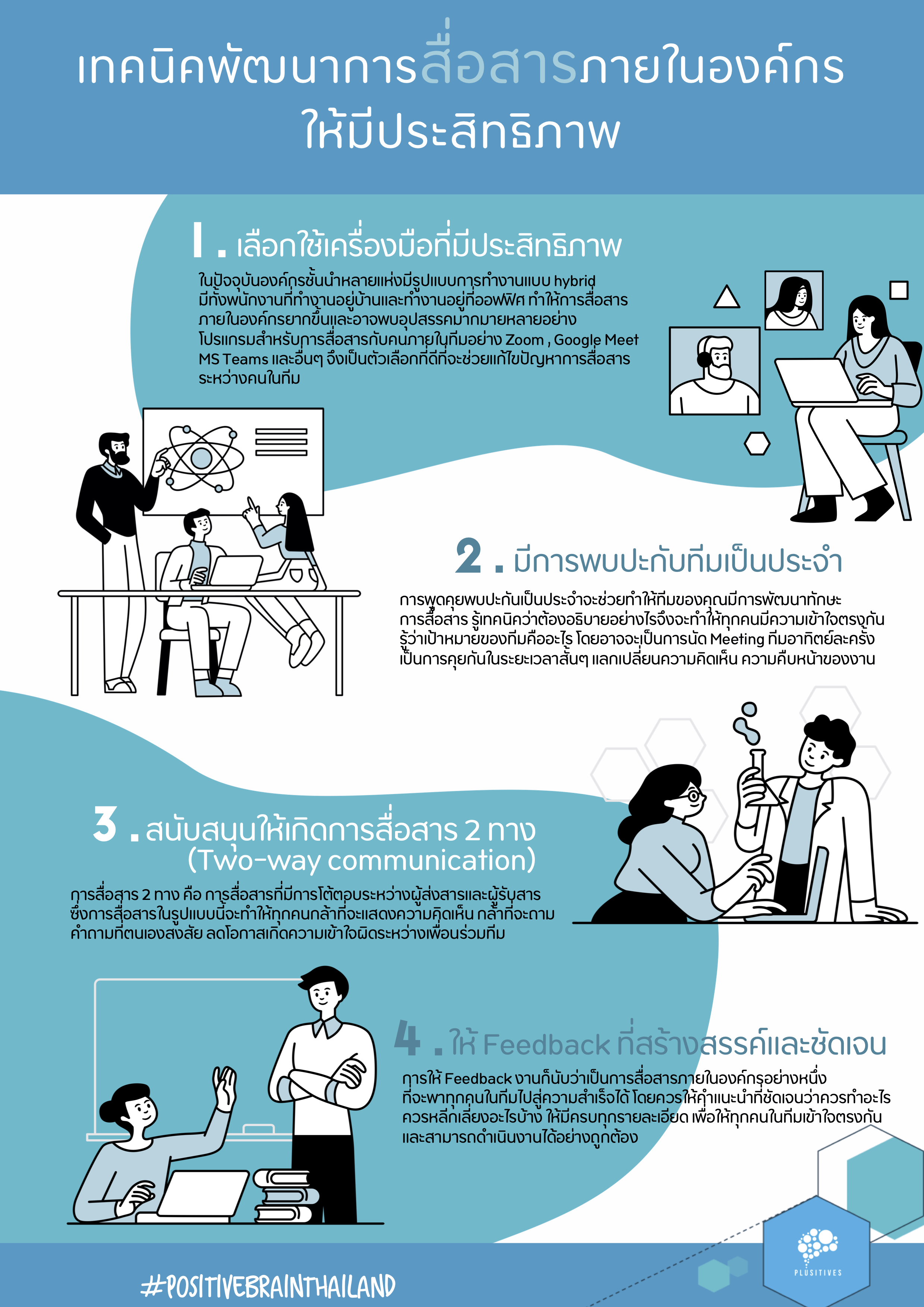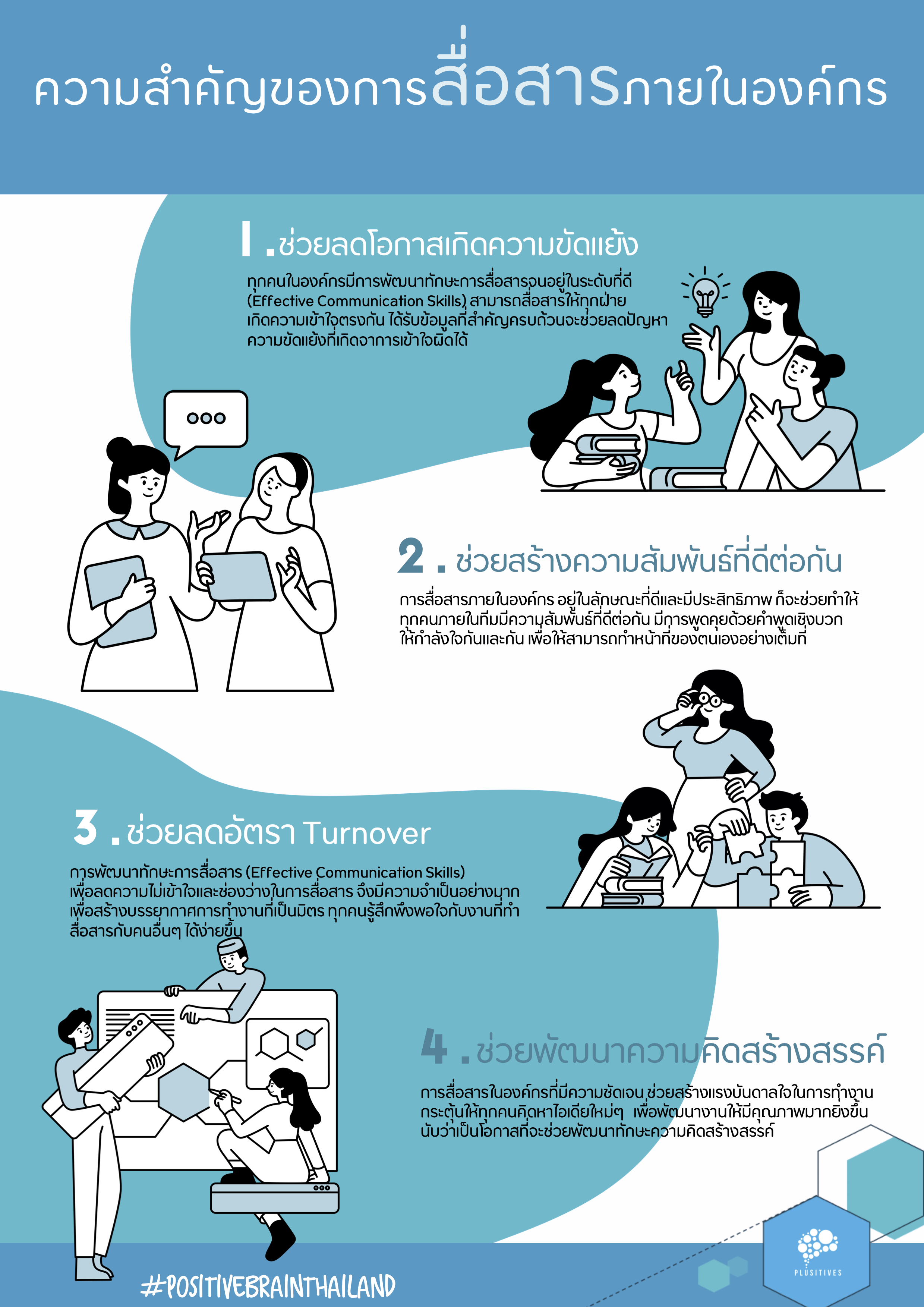 การสื่อสารภายในองค์กรมีความสำคัญและส่งผลต่อความสำเร็จขององค์กรเป็นอย่างมาก จึงควรมีการพัฒนาทักษะการสื่อสารให้กับพนักงานทุกระดับ เพื่อให้สภาพแวดล้อมในการทำงานเป็นมิตรต่อพนักงาน ส่งผลให้โปรเจ็กต์ต่างๆ ดำเนินไปได้ด้วยดีและช่วยให้องค์กรเติบโตอย่างมั่นคง ดังนั้น เริ่มต้นพัฒนาตอนนี้ก็ยังไม่สาย แค่ลองทำตามบทความนี้ Plusitives เชื่อว่าทุกคนจะสามารถสร้างการสื่อสารที่มีประสิทธิภาพให้เกิดขึ้นภายในองค์กรได้อย่างแน่นอน