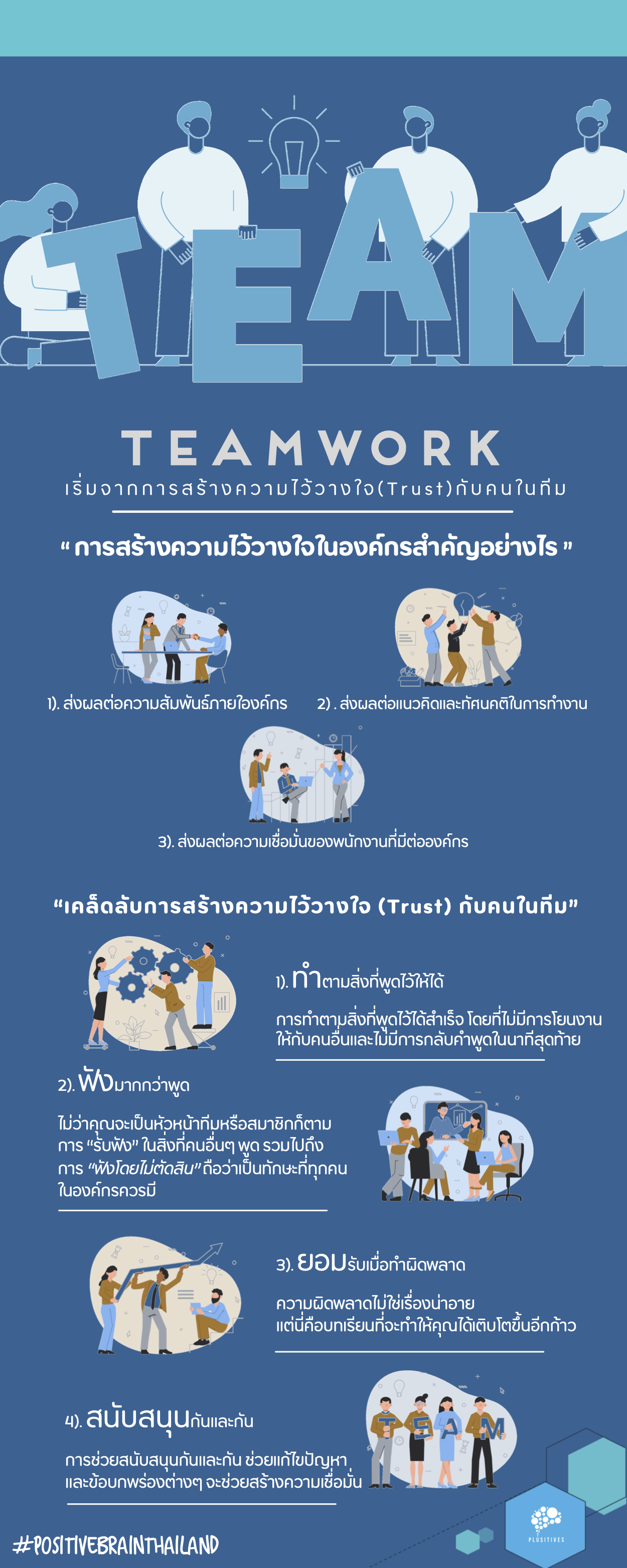 ทั้งหมดนี่คือวิธีการสร้างความไว้วางใจ (Trust) ให้กับคนในทีม ที่คุณเองก็สามารถนำไปปรับใช้กับการทำงานได้ แต่ต้องอย่าลืมว่า ความไว้วางใจนั้นไม่สามารถสร้างขึ้นได้ภายในระยะเวลาสั้นๆ แต่ไม่ใช่ว่าจะสร้างขึ้นไม่ได้ หากต้องการสร้างทีมที่ดี มีประสิทธิภาพ ให้เริ่มต้นสร้าง Teamwork ตามที่ Plusitives ได้นำมาฝากกันตั้งแต่วันนี้ อนาคตองค์กรต้องสามารถไปได้ไกลแน่นอน