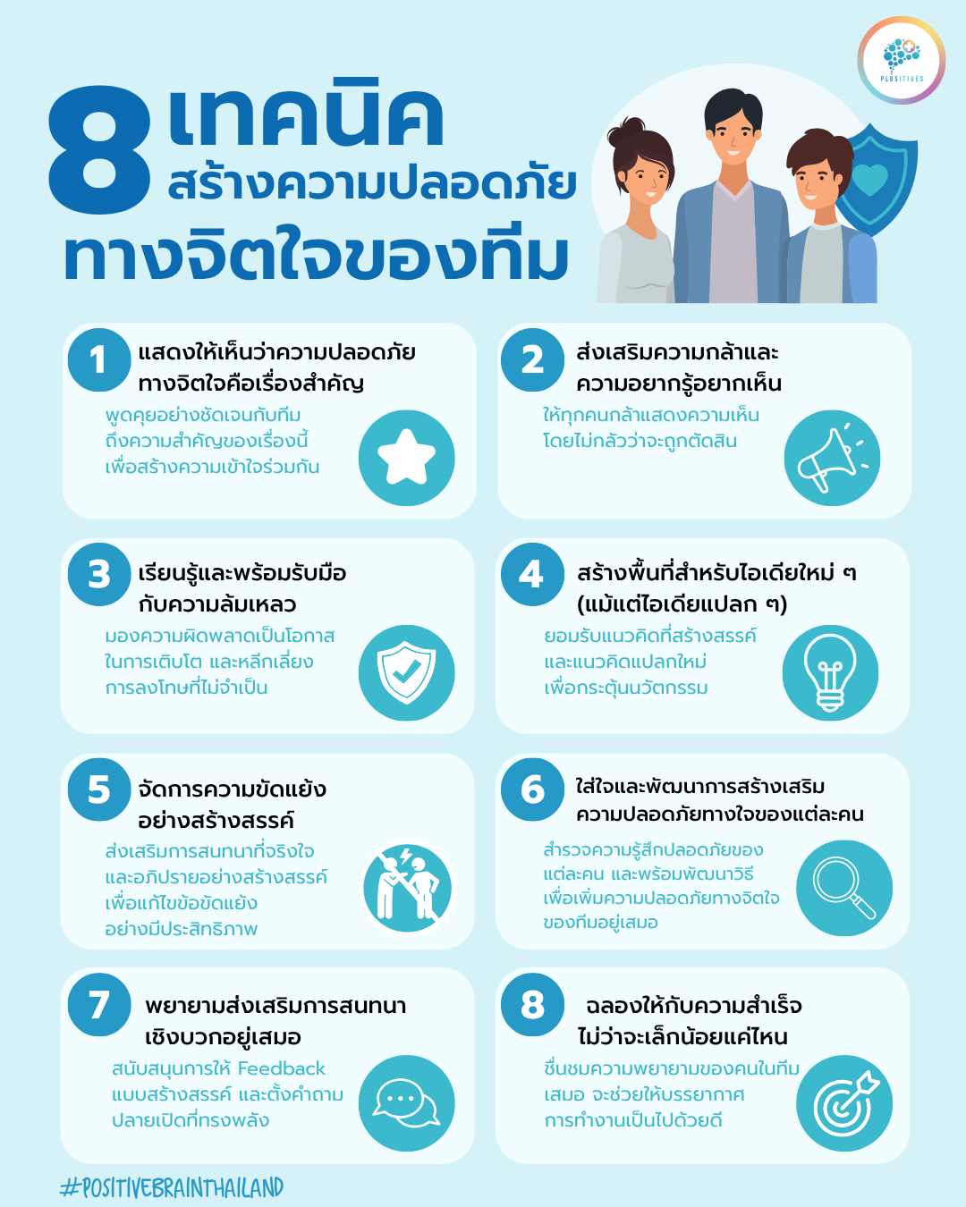 ความปลอดภัยทางด้านจิตใจ (Psychological safety) คือ การมีอิสระในการแสดงความคิดที่จะช่วยให้คนในทีมไม่มีความกังวลหรือหวั่นวิตก ในแง่การทำงานของสมองนั่นเมื่อเรารู้สึกผ่อนคลาย ไม่เครียด สมองจะหลั่งฮอร์โมนแห่งความสุขที่จะส่งผลให้ก่อให้เกิดไอเดียสร้างสรรค์แปลกใหม่ต่าง ๆ และเมื่อสามารถคิดไปไกลนอกกรอบได้อย่างอิสระยังสามารถต่อยอดให้เกิดการทำงานมีที่ประสิทธิภาพและผลักดันนวัตกรรมอีกด้วย วันนี้ทีม Plusitives จึงขอพาทุกท่านทำความรู้จักกับ ความปลอดภัยทางด้านจิตใจ (Psychological safety) และเทคนิคสุดเจ๋งที่จะสร้างพื้นที่การทำงานที่ปลอดภัยให้เกิดขึ้นในองค์กรพร้อม ๆ กันค่ะ จะเป็นอย่างไร ติดตามได้ในบทความนี้พร้อม ๆ กันค่ะ